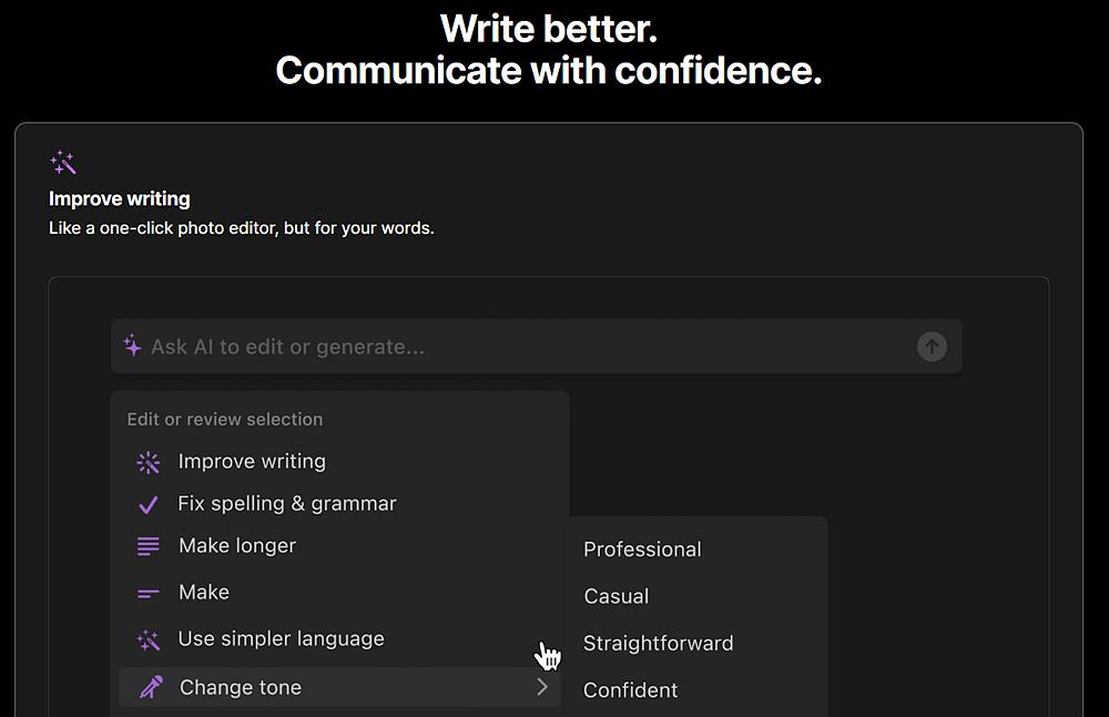 英文拼写检查工具Grammarly也推出了AI服务GrammarlyGo,它可以根据用户输入的关键词提示来生成邮件草稿,或是帮现有文章更换语气与文字风格、调整文章的长度等,并为主题写作起草大纲。