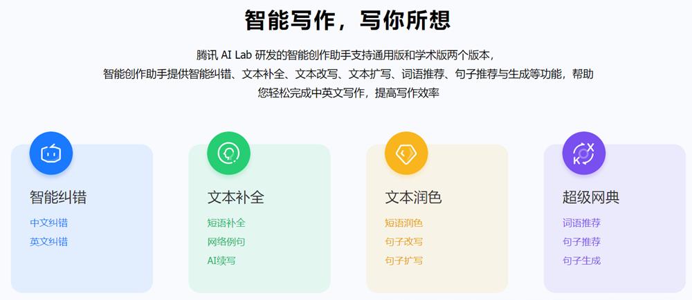 文涌Effidit(Efficient and Intelligent Editing)是由腾讯AI Lab研发的智能写作助手,利用AI技术来辅助写作者发散思路、丰富表达,并提升文本编辑和写作的效率,所具备的功能包括有智能纠错、文本补全、文本改写、文本扩写、词语推荐、句子推荐、生成等功能。