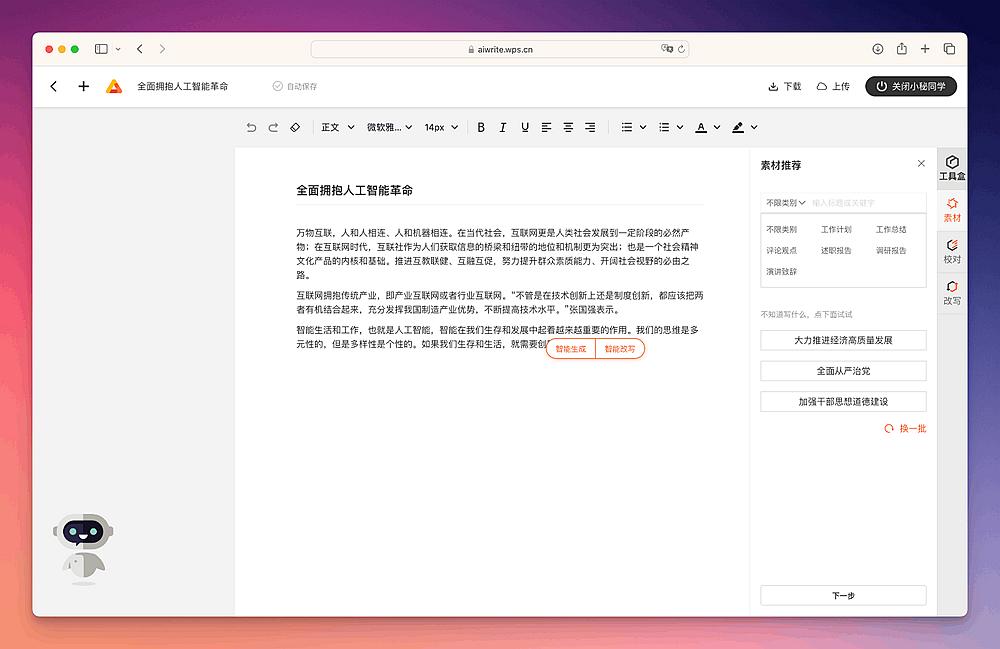 其文本数据和相关信息来源于权威媒体和政府公开网站,题材覆盖讲话、总结、计划、新闻等多种写作场景,并与金山文档打通,可实现文本云端同步上传,用户在线写作后可以转到金山文档进行更加专业的排版等文档编辑。