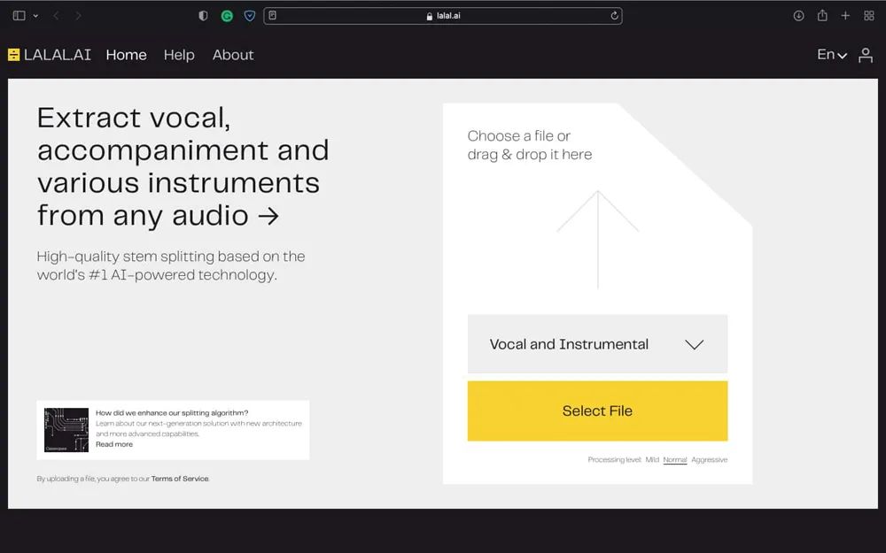 LALAL.AI是一款在线音乐分离工具,可以从音乐中分割并提取人声和乐器声。