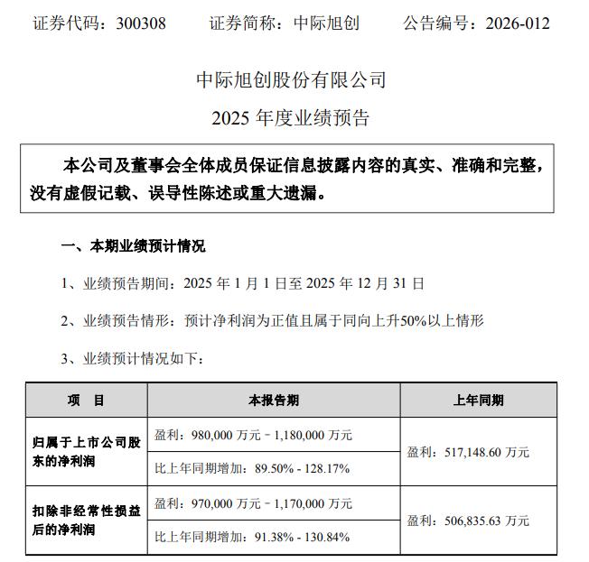 中际旭创:预计2025年净利润增长89.50%-128.17%